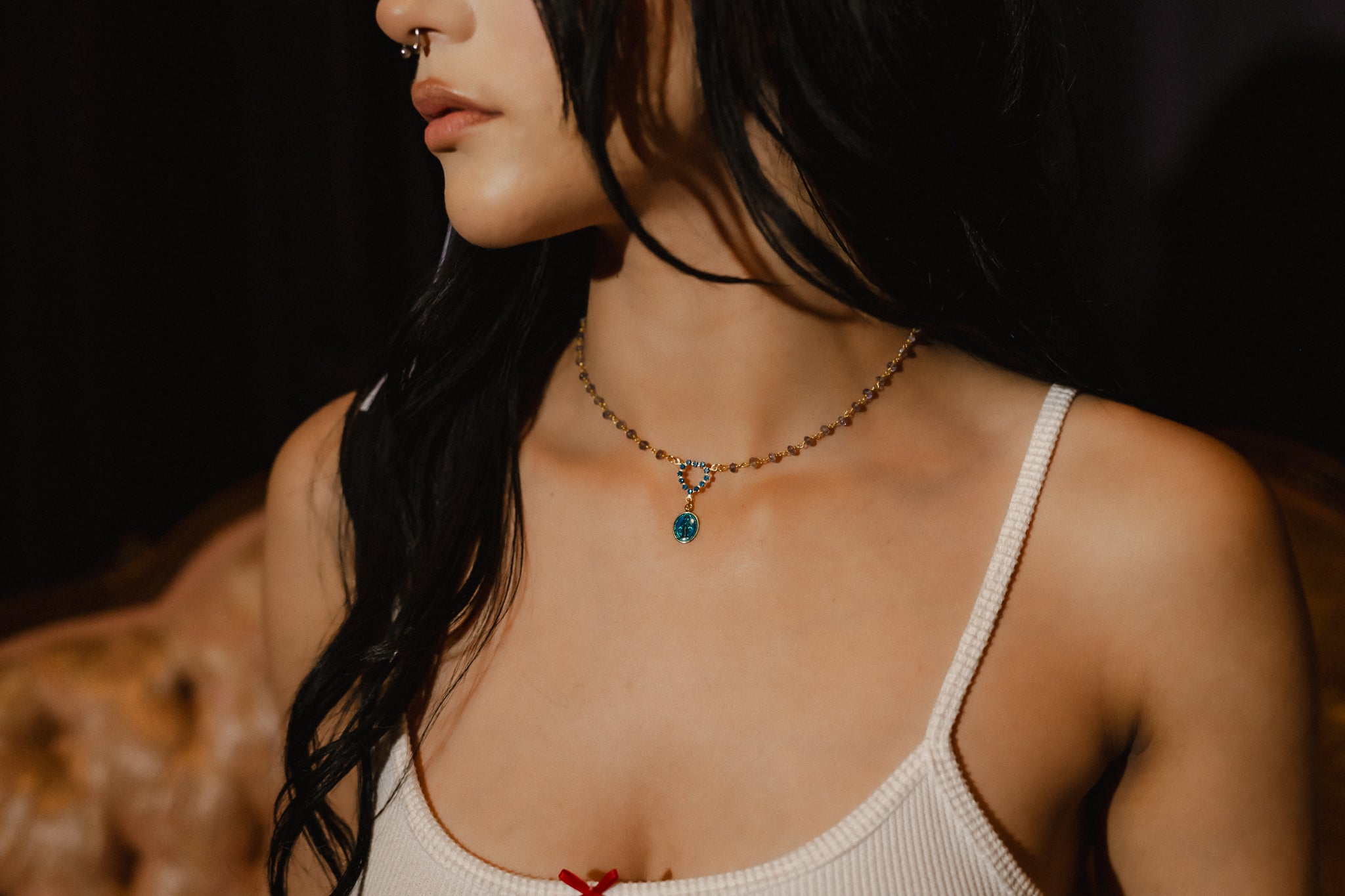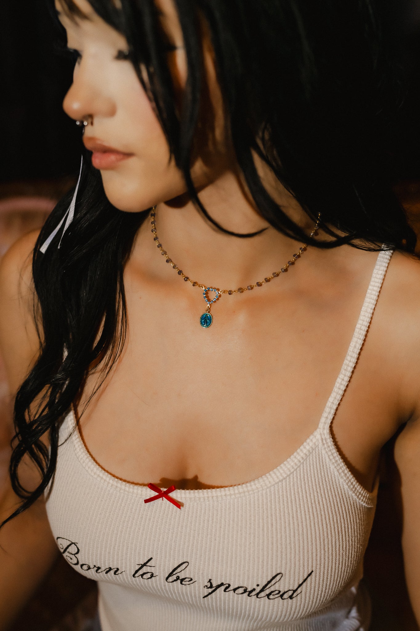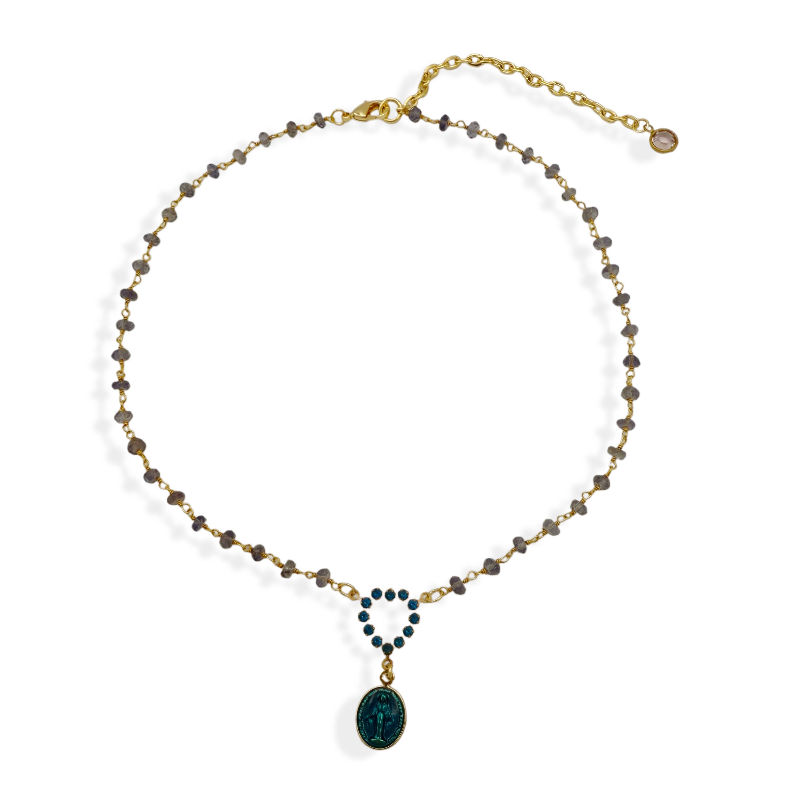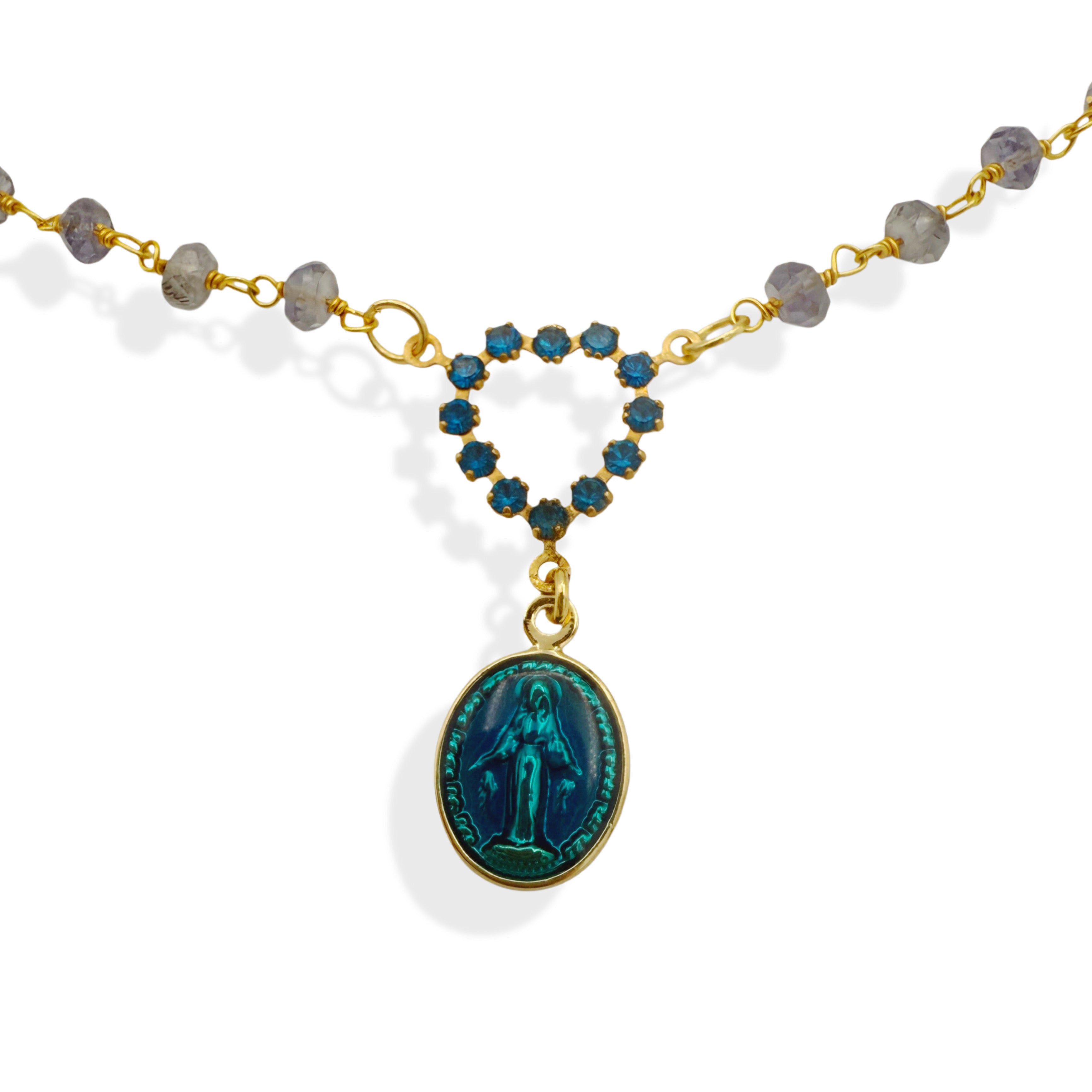 ♥ Details: a very rare dainty vintage cobalt blue swarovski heart charm, accompanied by a tiny gold plated and cobalt enamel miraculous medal charm. beautifully hanging on a genuine natural tanzanite gemstone and gold plated chain