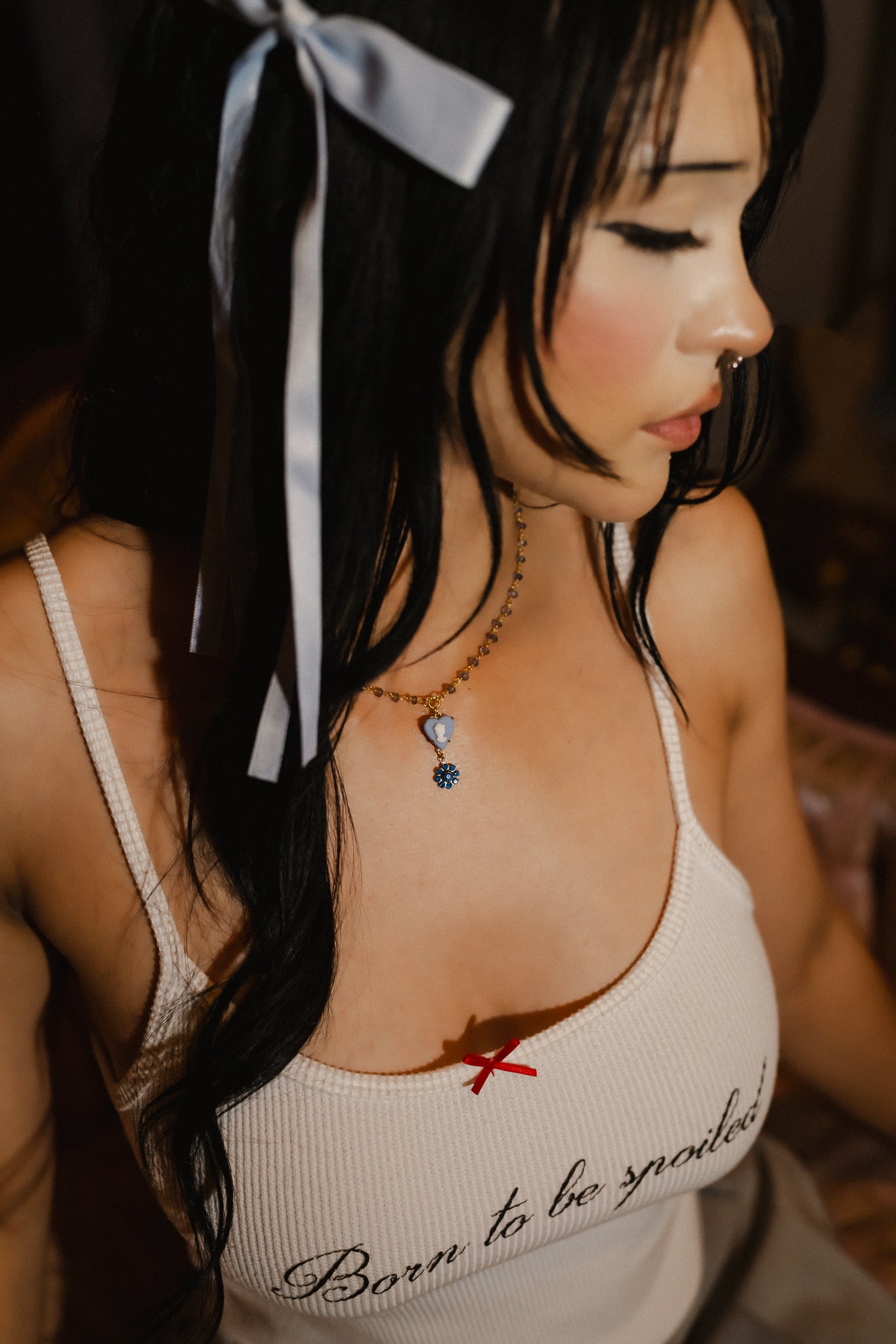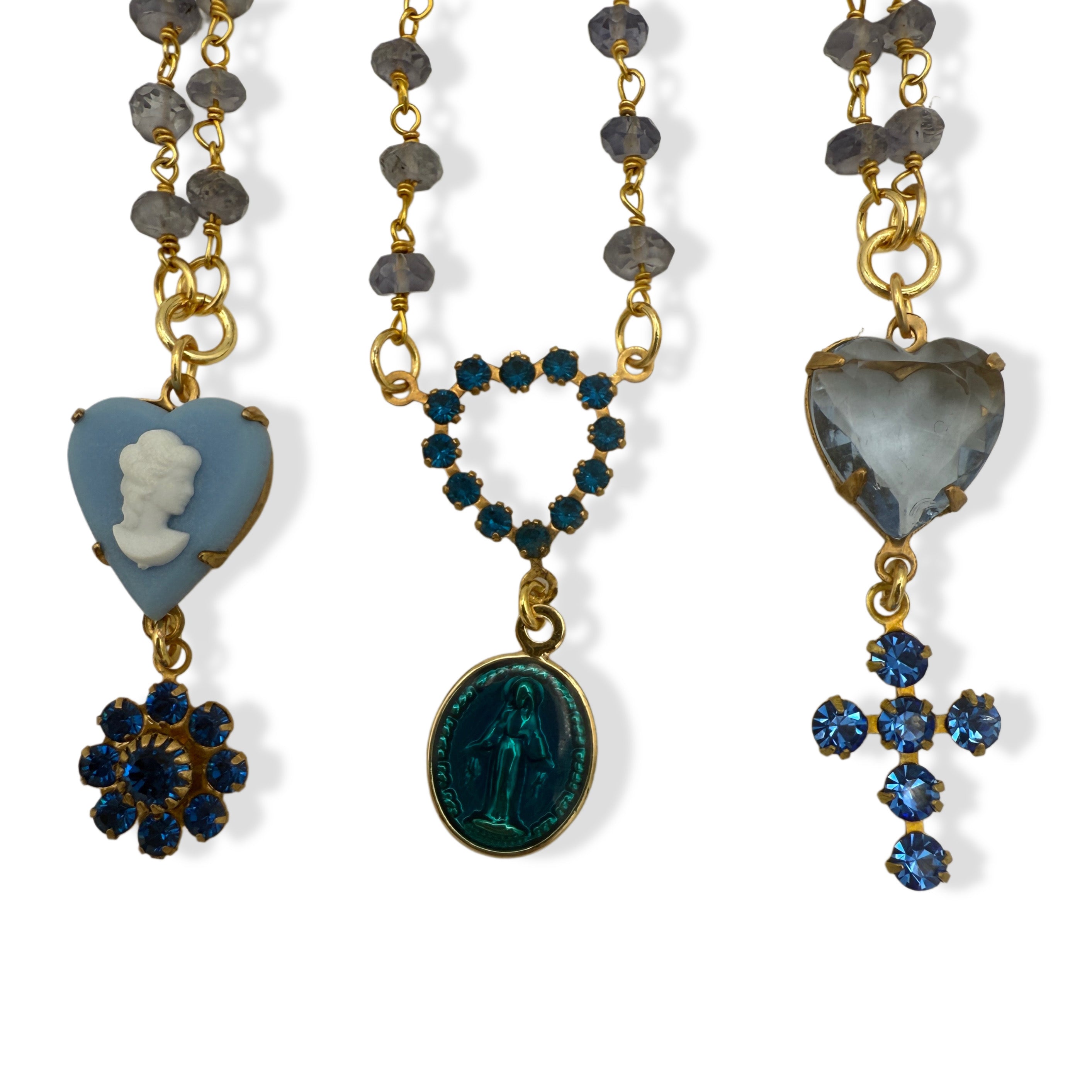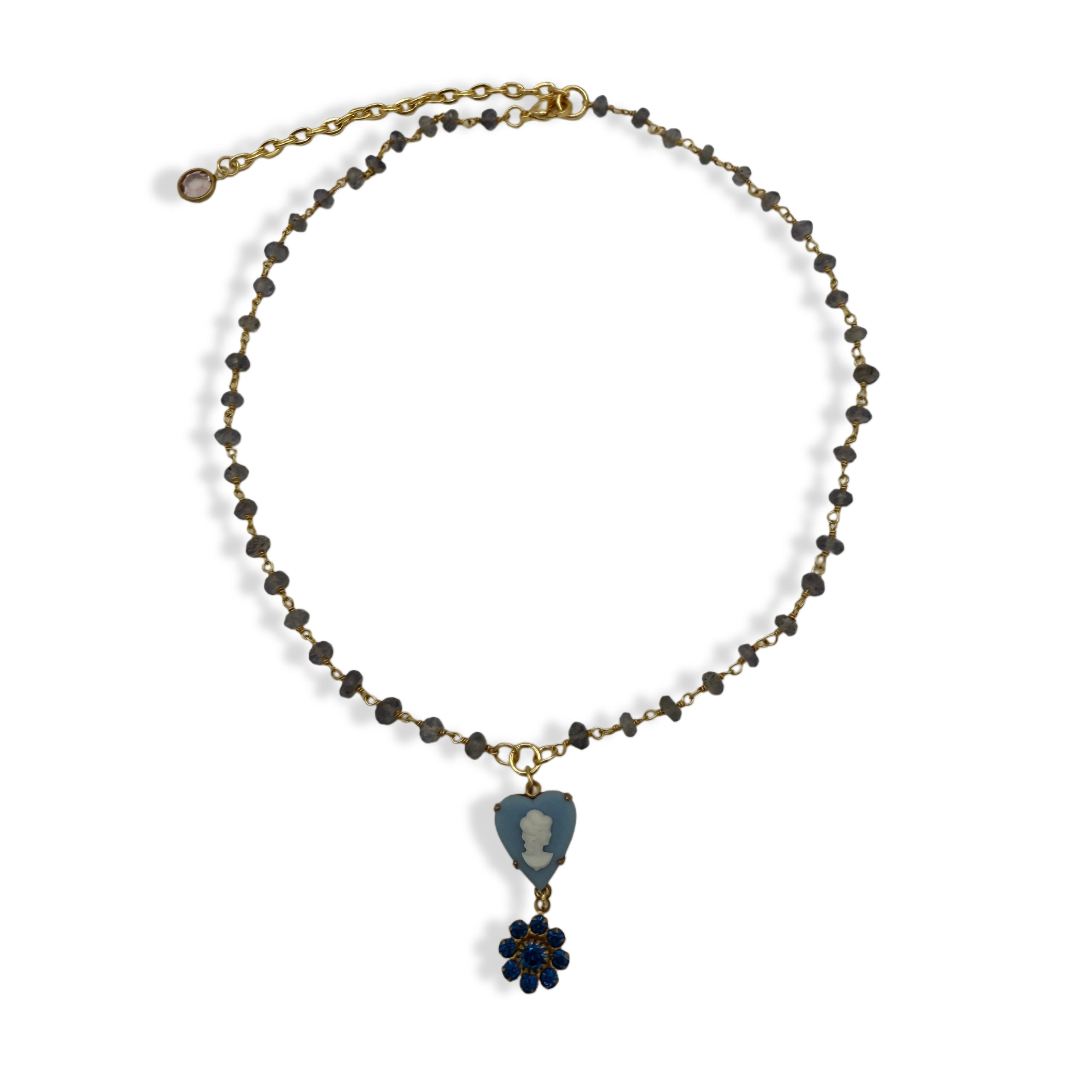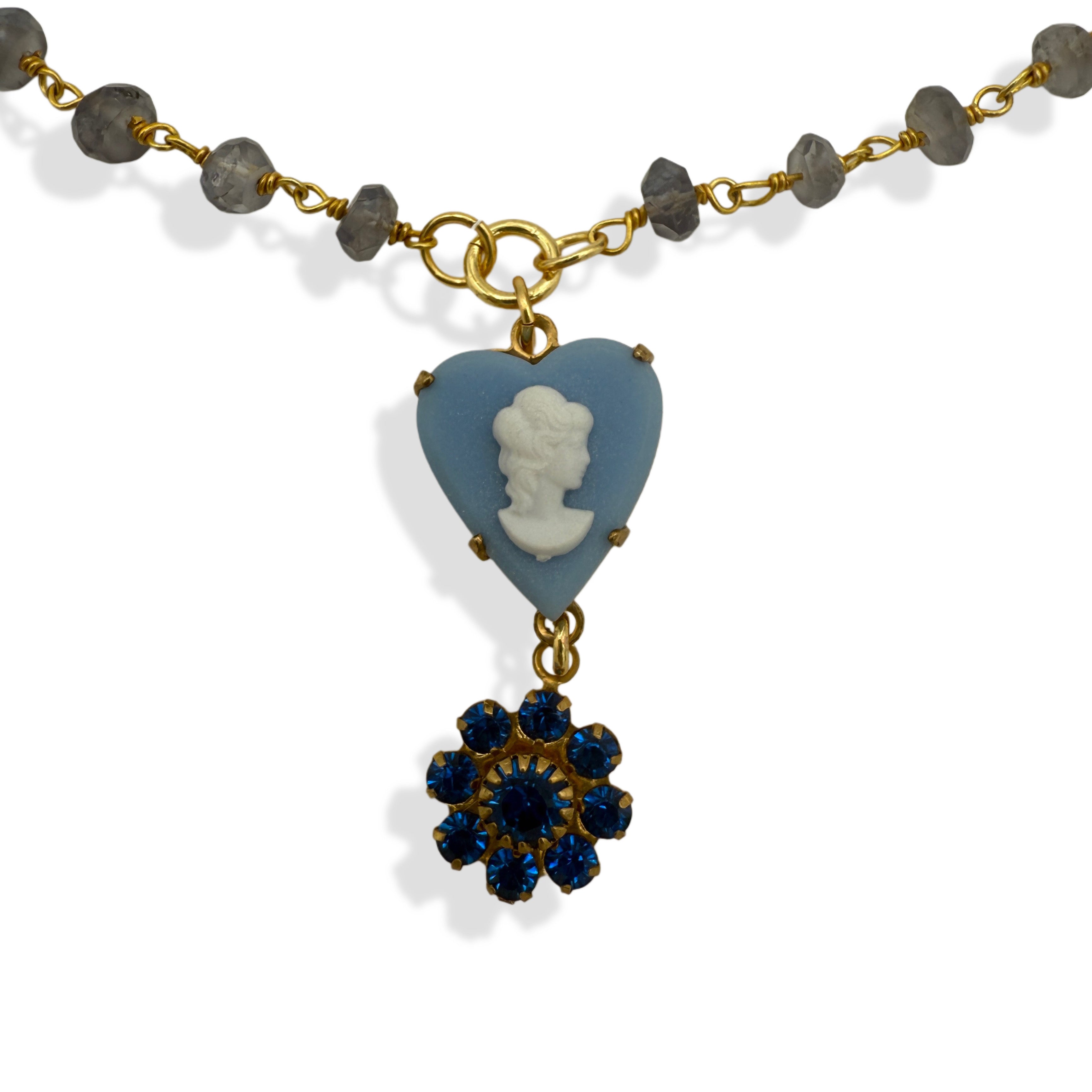 ♥ Details: a rare dainty vintage clear swarovski flower charm, accompanied by an elegant cameo charm. beautifully hung on a natural tanzanite crystal rosary style gold plated chain