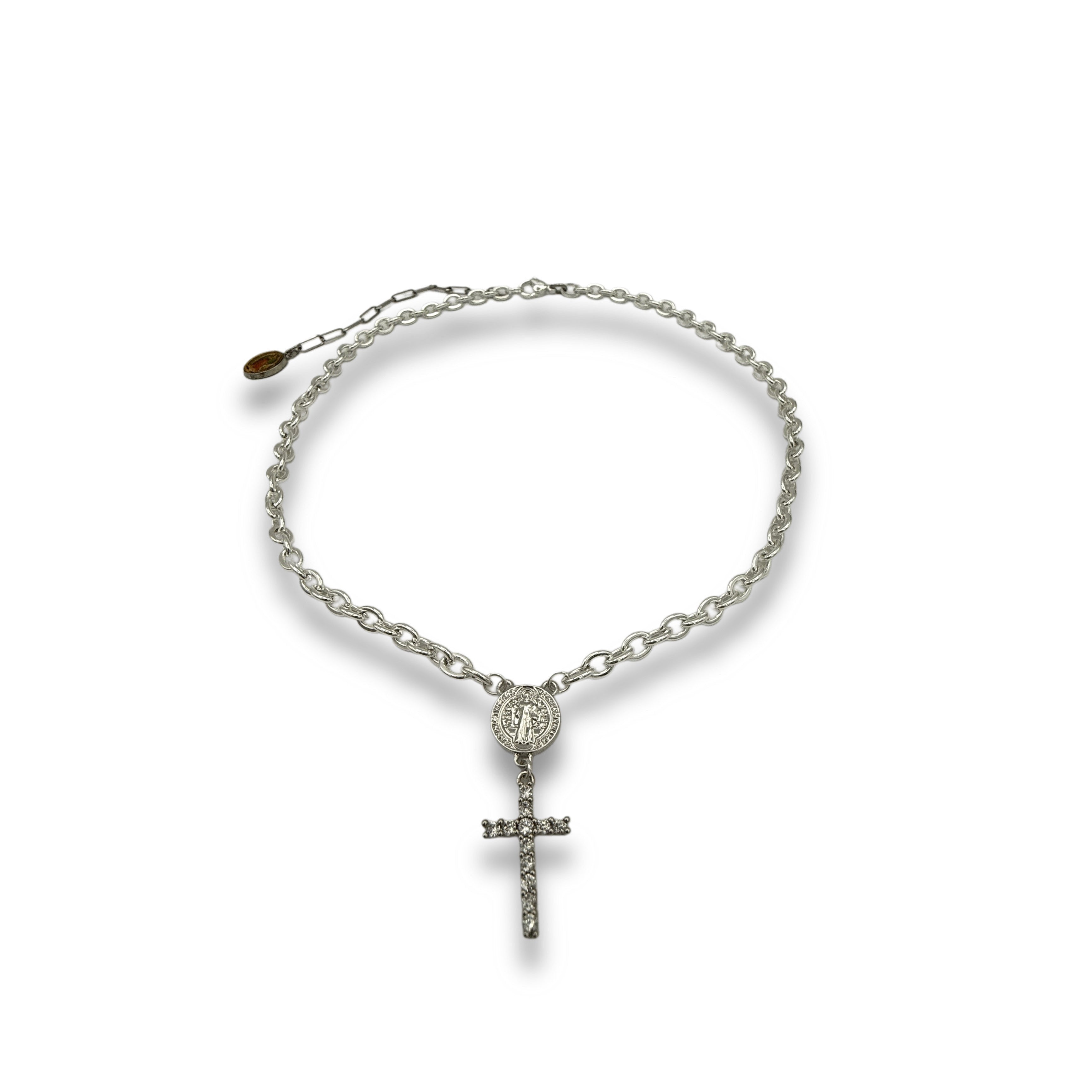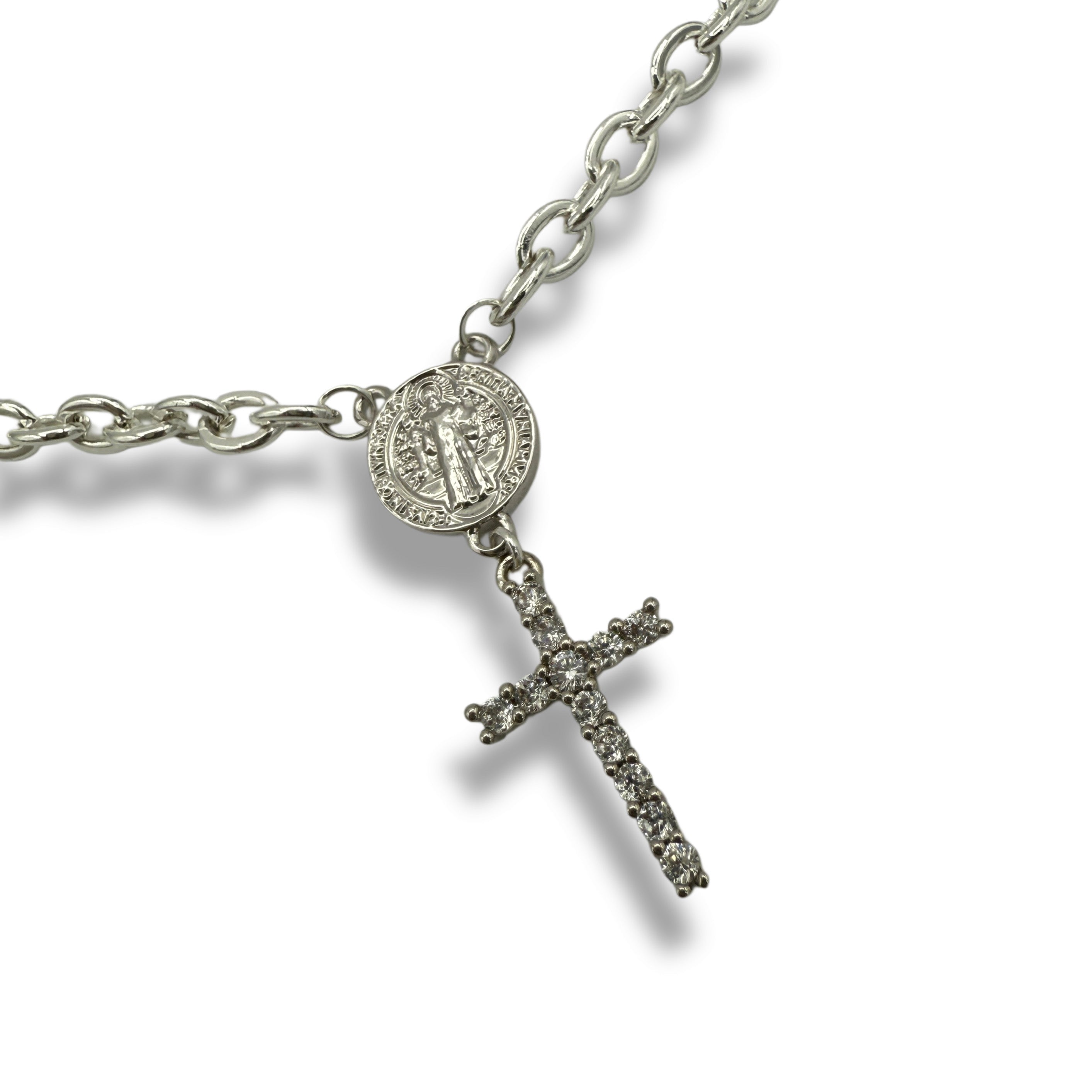 Details: the perfect combination of statement and simplicity. this cz crystal cross charm hangs from a saint benedict charm on a bright silver stainless steel chain